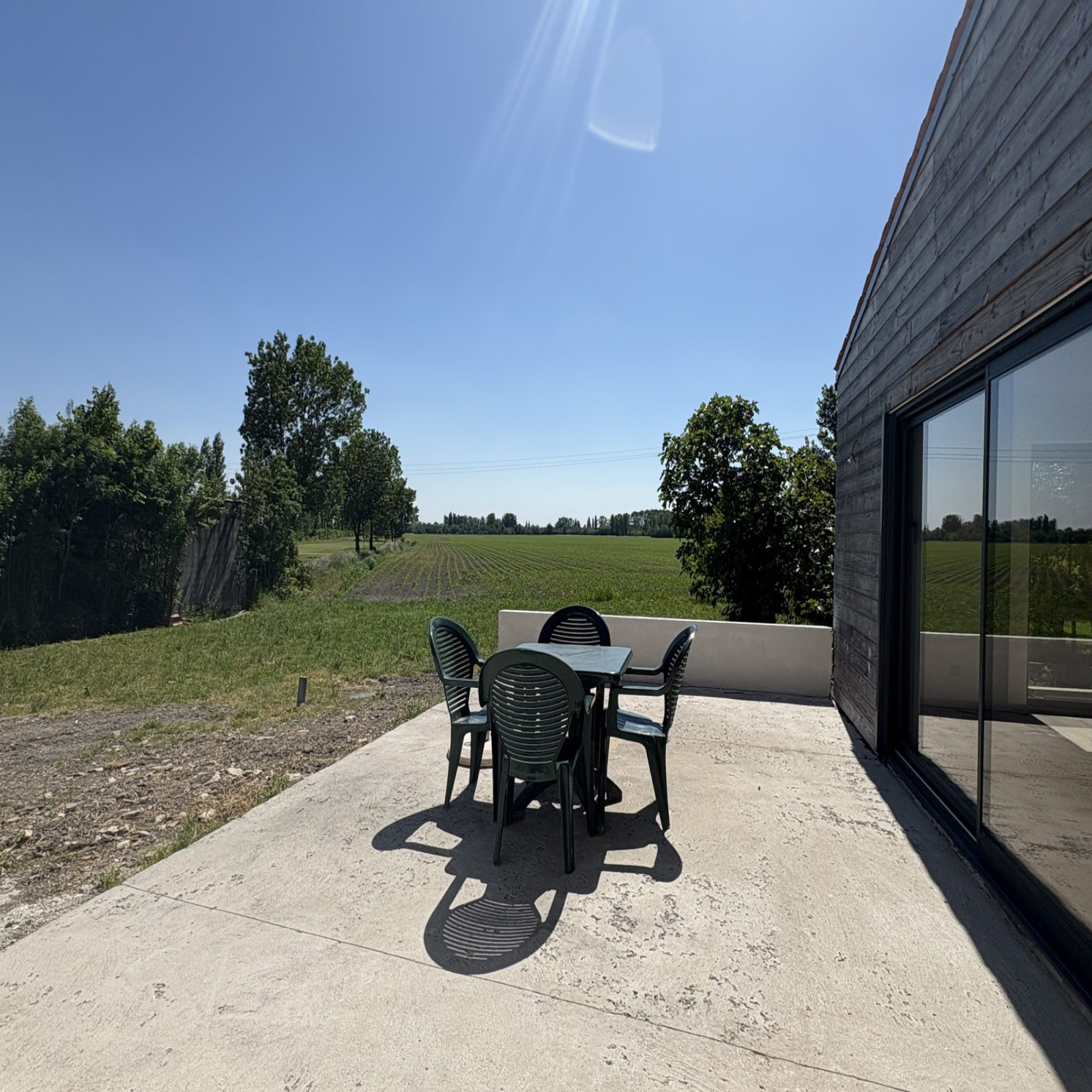 À l’extérieur, une grande terrasse avec vue dégagée sur les champs, idéale pour profiter du calme et de la nature.